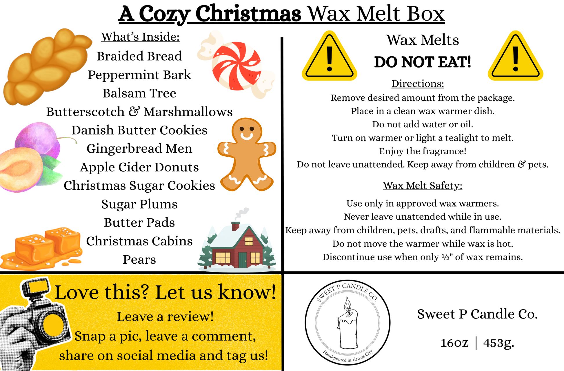 The theme for this year’s Christmas wax melt box is A Cozy Christmas! In this box, you will receive at least one pound (16 oz) of fun shaped wax melts per order.